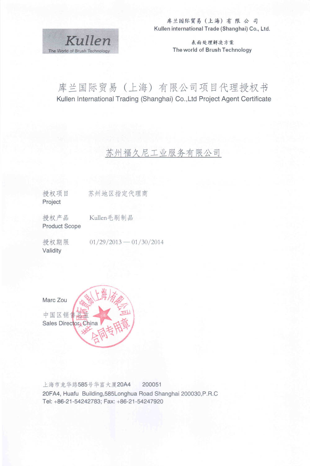 热烈祝贺我司南京分公司于2013年04月03日正式成立,并于同年03月27日获得德国S+S温湿度传感器及控制器中国唯一代理商资格,04月03日获得德国KULLEN钢丝刷代理授权证书。