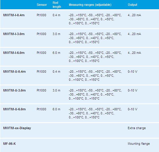 Calibrateable mean value temperature measuring transducer THERMASGARD® MWTM (rod sensor) with eight adjustable measuring ranges, continuous output, fully active flexible sensor rod for mean value measurement, plastic-coated copper protective tube (sturdy version), terminal box enclosure made of impact-resistant plastic and enclosure cover with quick-locking screws. This feeler is used for the detection of average temperatures (mean values) in gaseous media, e.g. in ventilation and air conditioning ducts over the entire cross section, or over a defined length. Laid meander-like it detects evenly the surrounding temperature as duct sensor. The mean value sensors are factory-calibrated. Adjustment ⁄ fine adjustment by the user is possible (range and zero point are adjustable). The mean value sensor MWTM is available in lengths of 0.4 m ... 20 m and as a standard is delivered including mounting flange. Mounting clamps MK-05-M can optionally be ordered as accessories.