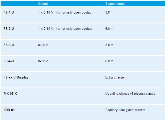 Electronic frost protection thermostat / frost monitor THERMASREG® FS with continuous and switching output, fully-active sensor rod, additional control input 0 – 10 V and summation output 0 – 10 V, optional with or without display. The frost sensor is used for monitoring air conditioning systems, heat exchangers, heating registers and similar equipment to prevent frost damages and freezing up. Falling below the limit value at the coldest measuring point of the capillary tube is detected. In case of capillary breakage, power failure, or electrical damage at the device, the relay automatically switches to frost. Mounting clamps MK-05-K are included in the delivery.