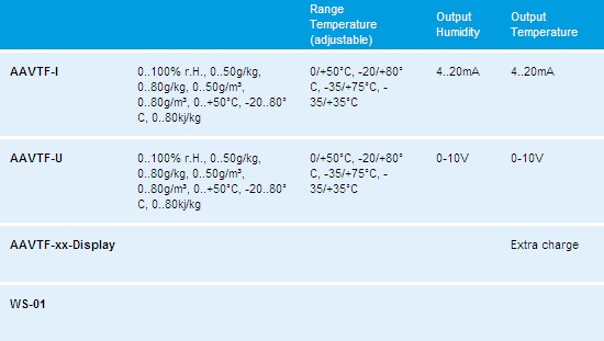 The universal humidity sensors HYGRASGARD® KAVTF and AAVTF are used to determine diverse characteristic variables in humidity measurement. Measured are the relative humidity and the temperature of ambient air. From these measurands, the different characteristic variables are internally calculated. At device version x-U, two outputs of 0…10 V are available, at Version x- I two outputs of 4 … 20 mA. Here the output variables for these outputs can be defined via DIP switches. Selectable for output 1 are relative humidity [% r.H.], absolute humidity [g ⁄ m³], mixture ratio [g ⁄ kg], dew point temperature [°C], or enthalpy [kJ ⁄ kg] (while neglecting the atmospheric air pressure). At output 2, four different measuring ranges for ambient temperature [°C] are selectable. Ex-factory condition (default) for output 1 is relative humidity 0 ...100 % r.H., for output 2 temperature measuring range 0 ... 50 °C. Because of the different configuration alternatives provided, numerous measurement and control tasks can be solved by means of just one device. These devices are to be operated in pollutant-free non-precipitating air, with neither aboveatmospheric nor below-atmospheric pressure at the sensors. Applications for example in medical technology, refrigeration, air conditioning, and clean room technology. These sensors are appropriate for wall mounting or for duct installation.
