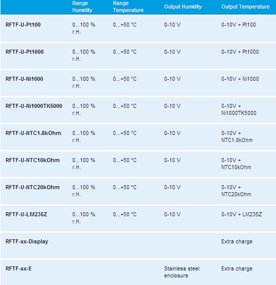 The calibrateable room humidity and temperature sensor HYGRASGARD® RFTF-U-x measures the relative humidity and temperature of air. It converts the measurands humidity into standard signals of 0 – 10 V or 4...20 mA and temperature into a passive resistor output. . These sensors are optional available with or without display (displaying actual humidity and actual temperature), in plastic or stainless steel enclosures. Relative humidity (in % r.H.) is the quotient of water vapour partial pressure divided by the saturation vapour pressure at the respective gas temperature. HYGRASGARD® RFTF-U-x is applied in non-aggressive dust-free ambiences in refrigeration, air conditioning and clean room technology, in indoor rooms, like living rooms, offices, hotels, technical rooms, meeting rooms and convention centres. These measuring transducers are designed for exact detection of humidity and temperature . A digital long-term stable sensor is used as measuring element for humidity measurement. Fine adjustment by the user is possible.