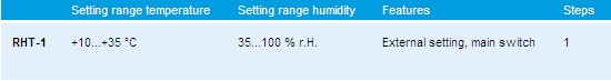 The mechanical room hygro-thermostat HYGRASREG® RHT (room hygrostat with (bimetal) temperature controller) is used for controlling and monitoring of relative humidity (humidifying and dehumidifying) and temperature in office and residential rooms, baths, winter gardens, labs, computer rooms, etc. HYGRASREG® RHT is applied in dust-free, pollutant-free, non-aggressive air.
