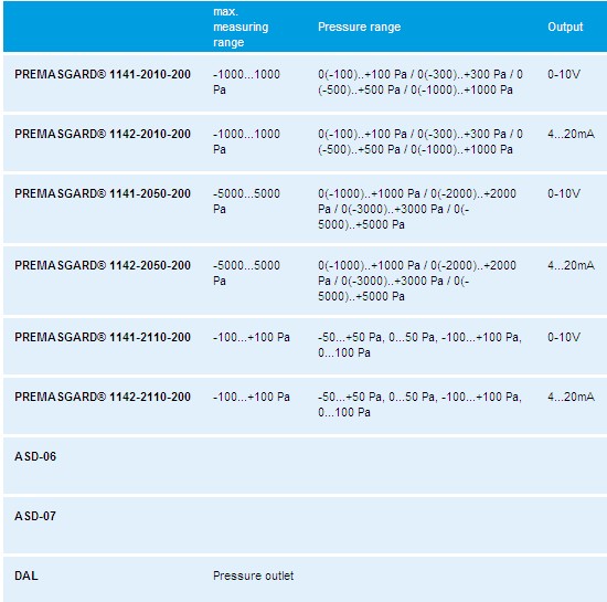 The calibrateable compact pressure sensors PREMASGARD® 1140 series are equipped with four switchable measuring ranges and with display (8 devices in one) and are used for measuring above-atmospheric, below- atmospheric, or differential pressures in air. The piezo-resistive measuring element is temperature and pressure compensated and guarantees a high degree of reliability and accuracy. These pressure transmitters have a pushbutton for manual zero point calibration and an adjustable offset. Applications of these pressure sensors are in clean room, medical and filter technology, in ventilation and air conditioning ducts, in spray booths, in large-scale catering facilities, for monitoring filters, for level measurement or for triggering frequency converters. Media measured with these pressure transducers are air (non-precipitating), or other gaseous non- ggressive, noncombustible media. A PREMASGARD® 1140 series pressure sensor has 8 selectable measuring ranges and therefore, minimizes the diversity of types and stockkeeping while covering a greater range of applications. The differential pressure sensor is supplied including connection set ASD -06 (2 m connection hose, two pressure connection nipples, screws).
