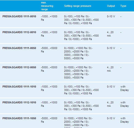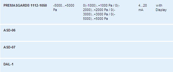 PREMASGARD® 1110 series calibrateable compact pressure sensors are equipped with eight switchable measuring ranges and optional with display (8 devices in one) and are used for measuring above-atmospheric, below- atmospheric, or differential pressures in air. The piezo-resistive measuring element is temperature and pressure compensated and guarantees a high degree of reliability and accuracy. These pressure transmitters have a pushbutton for manual zero point calibration and an adjustable offset. Applications of these pressure sensors are in clean room, medical and filter technology, in ventilation and air conditioning ducts, in spray booths, in large-scale catering facilities, for monitoring filters, for level measurement or for triggering frequency converters. Media measured with these pressure transducers are air (non - precipitating), or other gaseous non-aggressive, non-combustible media. A PREMASGARD® 1110 series pressure sensor has 8 selectable measuring ranges and therefore, minimizes the diversity of types and stockkeeping while covering a greater range of applications. The differential pressure sensor is supplied including connection set ASD-06 (2 m connection hose, two pressure connection nipples, screws).