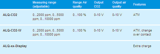 The self-calibrating microprocessor-controlled AERASGARD® ALQ-CO2 is a CO2 and mixed gas measuring instrument for on-wall installation and is used for the detection of air quality and/or the CO2 content in air within a range of 0 ppm to 2000 ppm CO2. It is optionally available with or without display. The measurement signals are converted into standard signals of 0 – 10 V. Optional, this device is available with switching output, a display, or with a combination of various output variants. The CO2 content in the air is determined by a NDIR sensor (non-dispersive infrared technology sensor) measurement range 0 … 2000 ppm CO2, the air quality by means of a mixed gas sensor / VOC sensor (volatile organic compounds), measurement range 0 – 100 % air quality. The detection range of the sensor is calibrated for standard applications. Room ventilation on an as-needed basis, improvement of well-being and customer benefit, increased comfort as well as a reduction of operating costs by saving energy are only some the beneficial results of employing AERASGARD® ALQ-CO2 sensors.